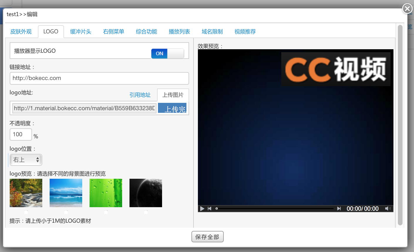 进入具体播放器编辑页面,点击LOGO标签,设置播放器LOGO。 用户可以选择上传或者外链一张图片作为播放器LOGO。