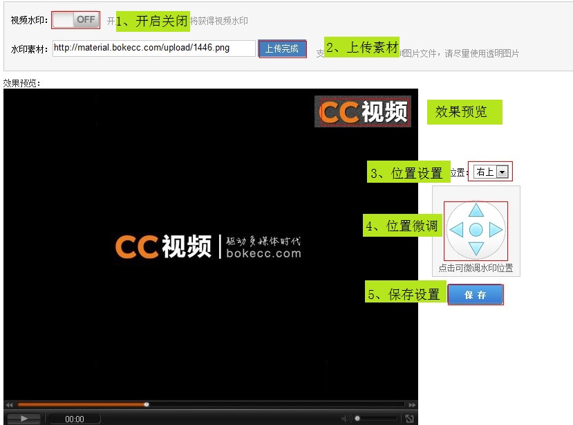 进入视频水印页面,可以进行水印编辑。 注:只对水印开启后上传的视频生效。