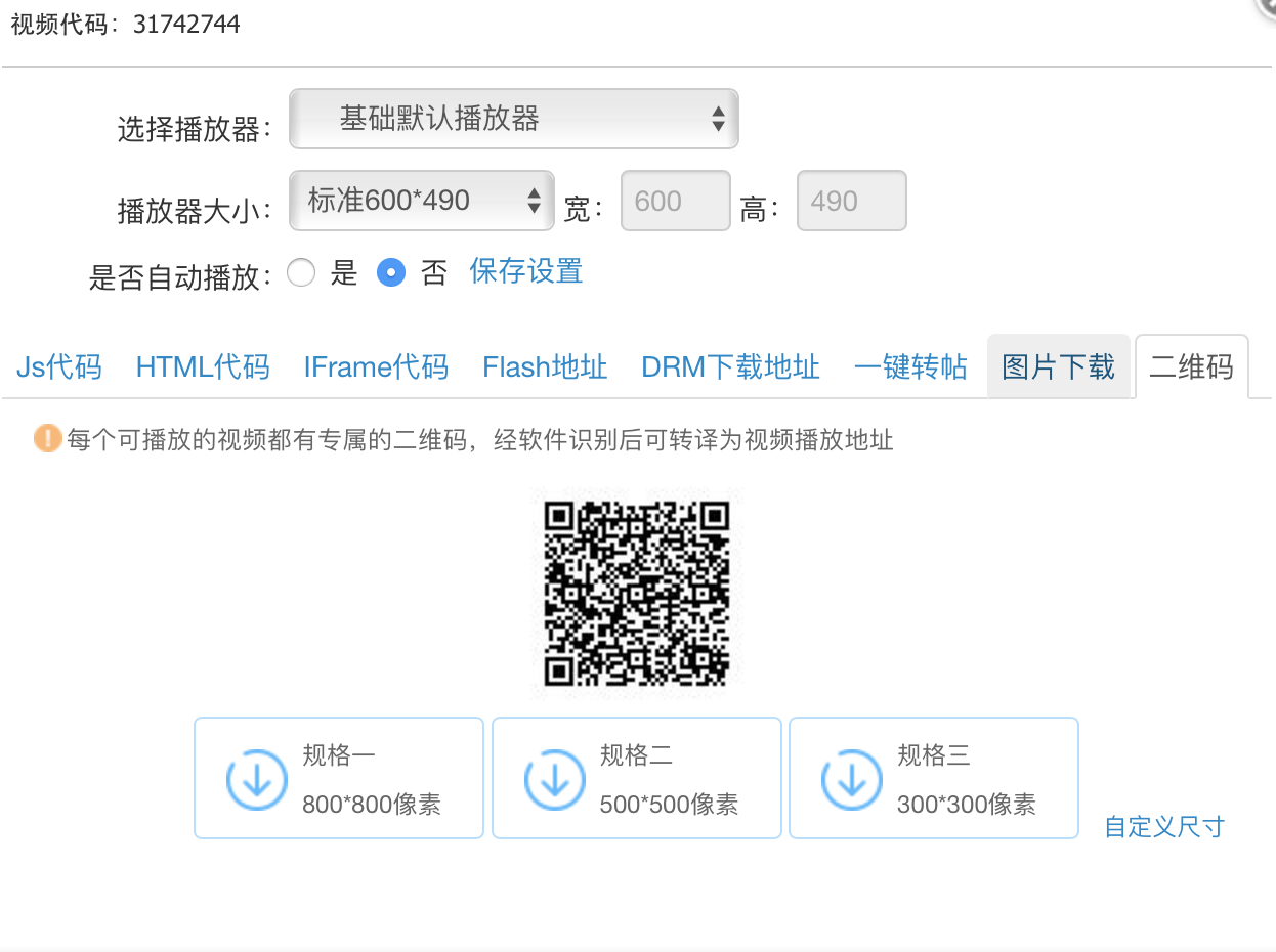 点击编辑,选择视频打点标签可直接扫描播放或下载到本地宣传使用。三种尺寸的二维码满足不同形式的应用需求,且可用户自定义二维码尺寸。